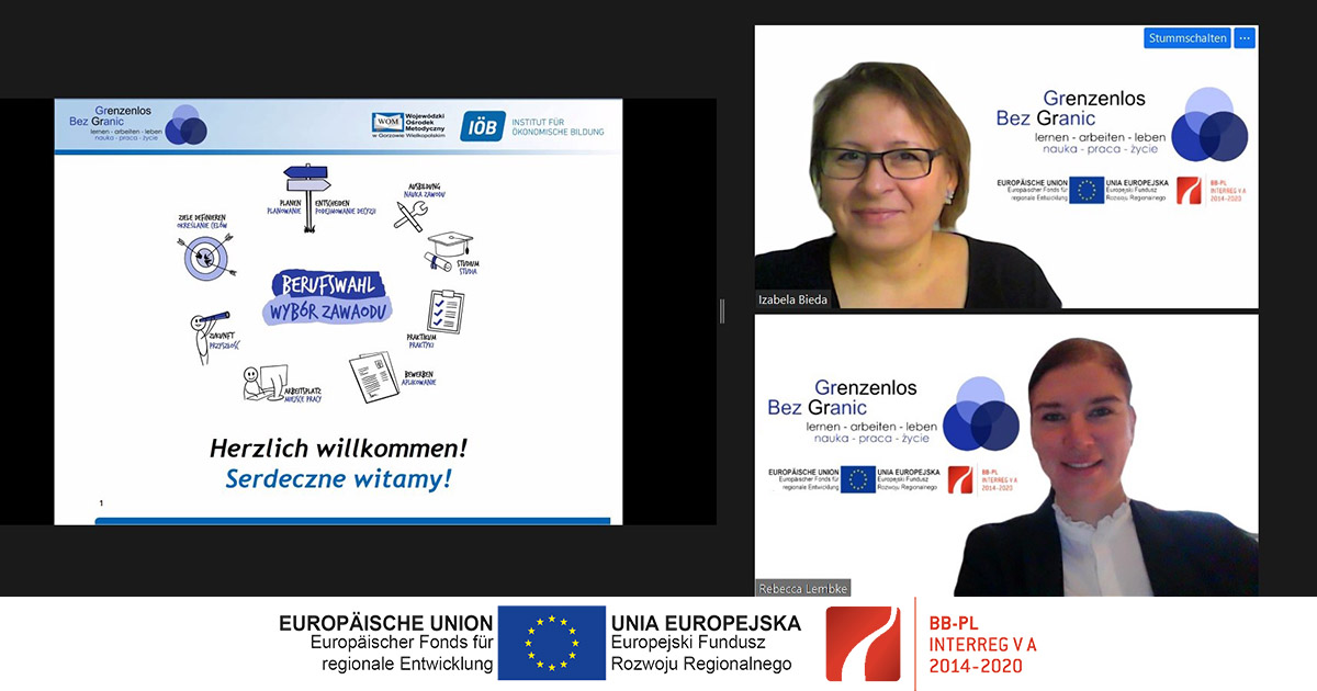 Am 29.-30. Oktober 2020 startete die erste Lehrerfortbildung in der Euroregion Pro Europa Viadrina, die vom Institut für Ökonomische Bildung Oldenburg (IÖB) und dem Methodikzentrum in Gorzów Wielkopolski (Polen) digital realisiert wurde. Die Fortbildung ist in das Projekt Interreg: Grenzenlos lernen - grenzenlos arbeiten - grenzenlos leben eingebettet und eröffnet eine Reihe von digitalen Angeboten, in welchen das deutsch-polnische Dozententeam gemeinsam mit den Lehrkräften aus der Euroregion Ansätze einer grenzüberschreitenden beruflichen Orientierung erarbeiten.